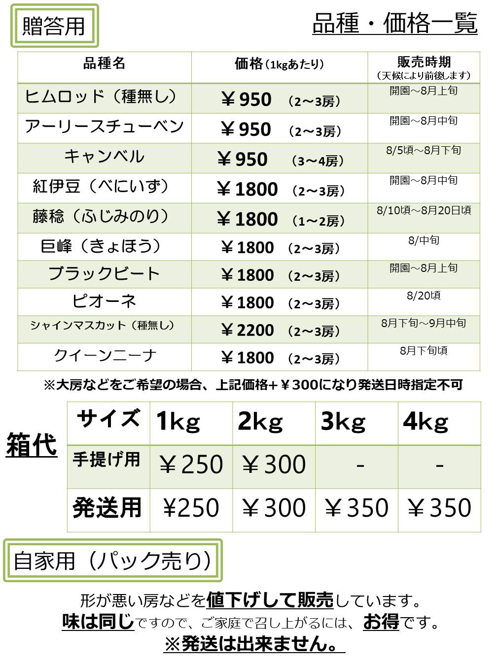 ブドウ代金+箱代+送料代+(冷蔵料金)