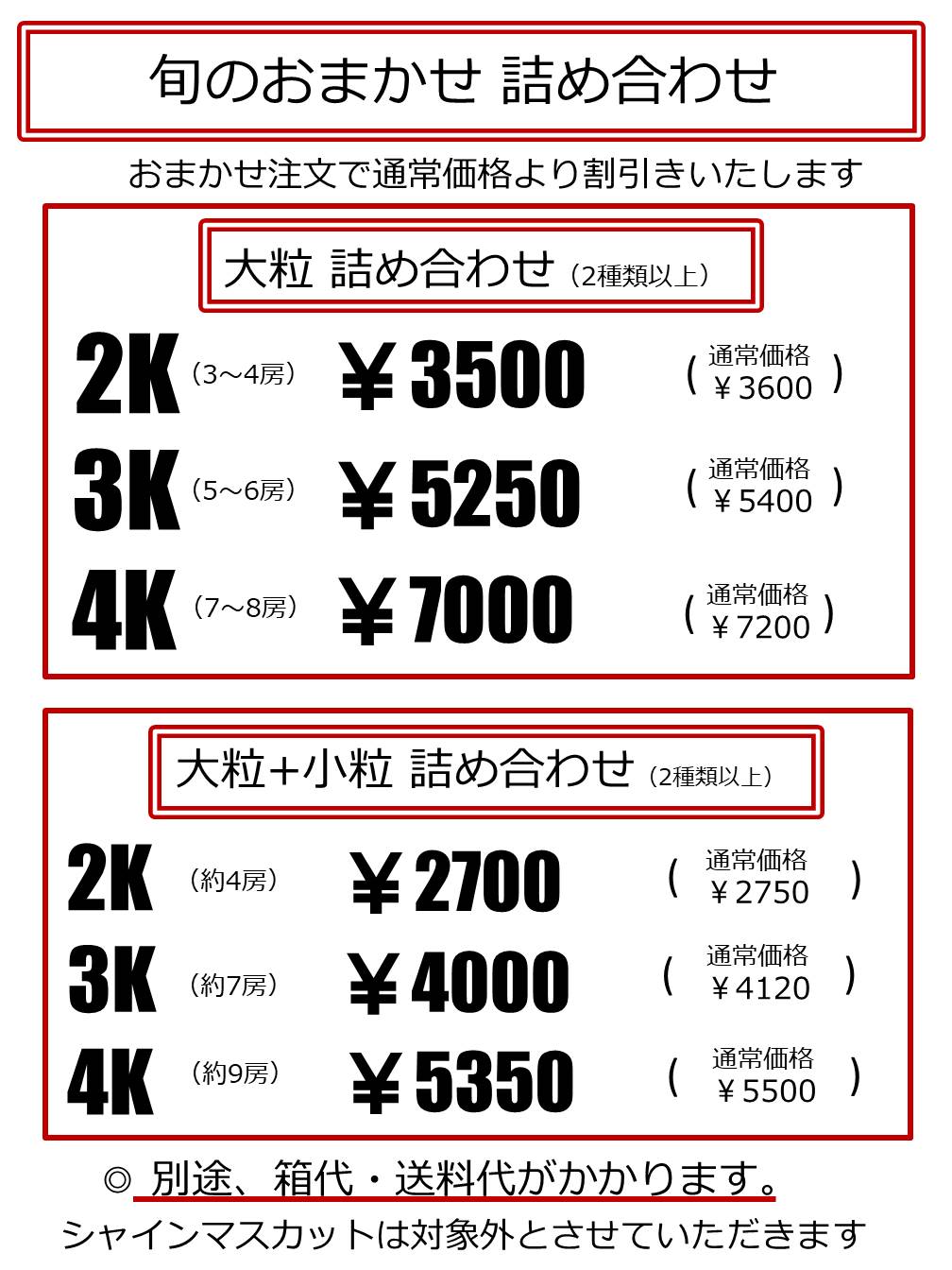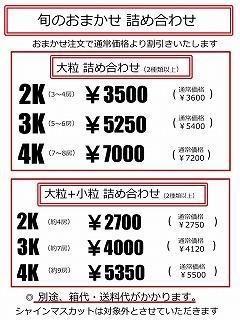 やや形の悪い房などを通常より量を増やし、値段を下げてパック売りしています。(価格はすべて2022年時点になります)